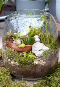 - Inhalt: Du bepflanzt ein stilvolles Glasgefäß mit vier verschiedenen, geeigneten Pflanzen. Kombiniert mit Moos, Steinen, Rinde und Erde entsteht dein einzigartiges Mini-Ökosystem.